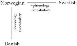 ![]() Relación entre el noruego y el sueco y danés. El noruego tiene una pronunciación más cercana al sueco pero su léxico es más cercano al del danés. |