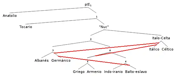 El árbol de Ringe-Warnow-Taylor, que deja fuera a las lenguas germánicas, ya que considerarlas implica que no existe un árbol de ajuste óptimo (es decir, filogenéticamente perfecto), tiene la siguiente forma:[12]