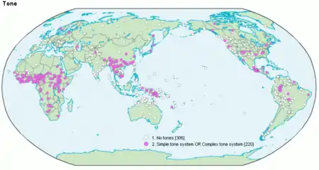 El tono es una característica fonológica que se encuentra en todos los continentes, aunque el ejemplo típico son las lenguas chinas de Asia. Un estudio sobre un amplio corpus de lenguas[1] estima que cerca del 40 % de las lenguas humanas son lenguas tonales. A pesar de su amplia difusión en el mundo, las lenguas tonales se concentran básicamente en cinco regiones: