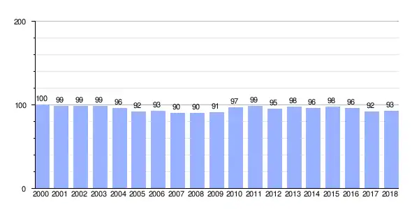 | Gráfica de evolución demográfica de Lens (aldea)[4] entre 2000 y 2018 |