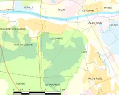 - Situación de Les Damps en un mapa de Francia y de comunas limítrofes (en francés)