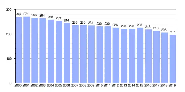 | Gráfica de evolución demográfica de Lesta entre 2000 y 2019 |