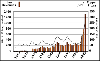 | Ley 13196 | 19 de noviembre de 1958 | 15 % de los ingresos por el impuesto a la gran minería del cobre (el impuesto era del 50%). | 8,5 millones USD | Introducción de pago en compensación si una cantidad más baja no puede ser lograda. Fondos se fijan en dólares estadounidenses (USD). |