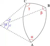 En el caso de un triángulo esférico, a, b y c corresponden a la medida angular de los segmentos de circunferencia maximal[13] [BC], [AC] y [AB] (ver Fig. 7).