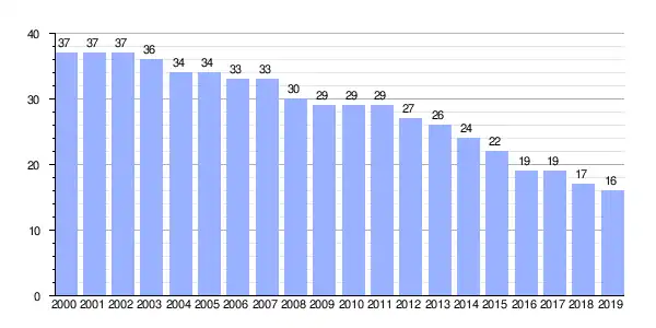 | Gráfica de evolución demográfica de Liñares (parroquia) entre 2000 y 2019 |