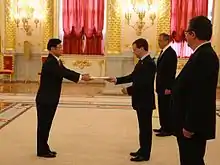![]() Dmitri Medvédev recibiendo las cartas credentiales de Li Yun-ho 03 de junio de 2010 en el Kremlin de Moscú | ||