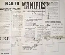 ![]() Documentos superpuestos sobre el comunismo en Venezuela, localizados en el Libro Rojo y recopilados por el Servicio Secreto de Inteligencia del General Eleazar López Contreras. | ||
