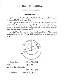 ![]() La primera página del Libro de los Lemas como se ve en Los Trabajos de Arquímedes (1897) | ||
