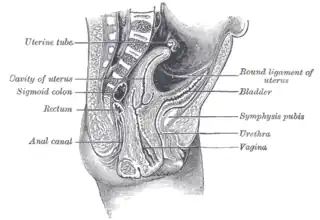 ![]() Corte sagital de la pelvis de una niña recién nacida. (Ligamento redondo etiquetado en la parte superior derecha). | ||
