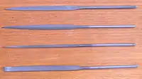 - Limas de aguja o limas de relojero: son las más pequeñas que se fabrican y se suministran en un estuche con las diferentes formas que existen. Se utilizan cuando el acabado superficial es extremadamente fino y preciso.