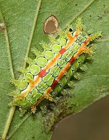 Las larvas pueden confundirse con las larvas aplanadas de las orugas de mariposas Lycaenidae, pero estas tienen patas más largas, son más gruesas, y siempre están cubiertas de densos pelos cortos o cerdas.