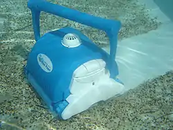 Estos limpiadores son independientes del filtro principal de la piscina y del sistema de bombeo y funcionan con una fuente de electricidad separada, generalmente en forma de un transformador que se mantiene al menos a 3 m de la piscina. Tienen dos motores internos: uno para aspirar agua a través de una bolsa de filtro autónoma y expulsar el agua filtrada de regreso a la piscina, y otro que es un motor de accionamiento conectado a orugas de goma o sintéticas similares a un tractor y "cepillos" atados por bandas de caucho o plástico a un eje de metal.[3][4] Los cepillos, que se asemejan a los rodillos para pintar, están ubicados en la parte delantera y trasera de la máquina y ayudan a eliminar las partículas contaminantes del piso y las paredes de la piscina (en algunos diseños se incluyen incluso los escalones de la piscina) según el tamaño y la configuración. También dirigen las partículas hacia la bolsa de filtro interna.