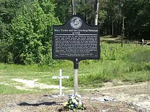 El 15 de mayo de 2010, se colocó una placa en honor a Mary Turner cerca del sitio donde se produjo el linchamiento.[17] La placa incluye una descripción de los asesinatos asociados de personas negras por parte de multitudes blancas en 1918, especialmente los linchamientos de los Turner.[18][19] En julio de 2013, se descubrió que la placa tenía cinco agujeros de bala disparados por un vándalo desconocido.[20]