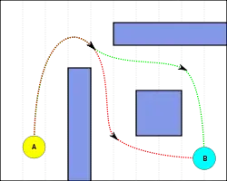 Thomas Colcombet tenía la idea de desarrollar un juego similar al Warcraft, un juego de estrategia en el que enfrentan humanos contra orcos, el jugador tiene el control de las unidades y con un cursor marca hacia donde quiere que se posicionen y las unidades van a dirigirse hacia dicho lugar siguiendo el camino más corto entre la posición actual y la posición de destino. Thomas desarrolló las primeras versiones del algoritmo pero la idea del Warcraft fue abandonada y basándose enteramente en el algoritmo, programó Liquid War. El juego solo agrega la asimilación entre las partículas, el resto es el algoritmo el camino más corto. Las partículas seguirán al cursor buscando la forma más corta de llegar a través de los obstáculos. En la primera imagen se ve cómo las partículas del jugador rojo siguen al cursor y se aprecia cómo en el círculo 3 las partículas eligen seguir para arriba en vez de seguir hacia la izquierda para luego ir en línea recta (círculo 1) hacia el cursor. La distancia más corta entre dos puntos está en una línea recta