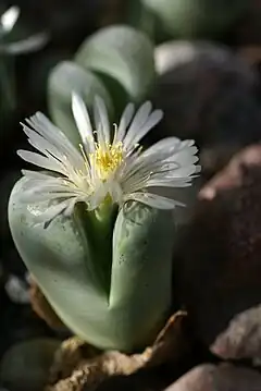 Forma grupos de dos hojas acopladas, divididas por una fisura por donde aparecen las flores. Cada par de hojas forman el cuerpo de la planta que tiene forma cilíndrica o cónica con una superficie plana. De la fisura entre las hojas brota, en periodo vegetativo, las nuevas hojas y en cuanto se abren, las antiguas se agostan. Alcanza una altura de 10 cm y las flores de color blanco.