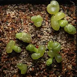 Forman grupos de dos hojas acopladas, divididas por una fisura por donde aparecen las flores. Cada par de hojas forman el cuerpo de la planta que tiene forma cilíndrica o cónica con una superficie plana. De la fisura entre las hojas brota, en periodo vegetativo, las nuevas hojas y en cuanto se abren, las antiguas se agostan. Las hojas son de color gris y arcilla, la lámina de la hoja superior es esférica, con una ventana transparente grande, las flores son de color blanco con tonos rosados.