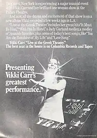 Live at the Greek Theatre es un álbum en vivo doble de la cantante estadounidense Vikki Carr. Fue publicado en noviembre de 1973 a través de Columbia Records.
