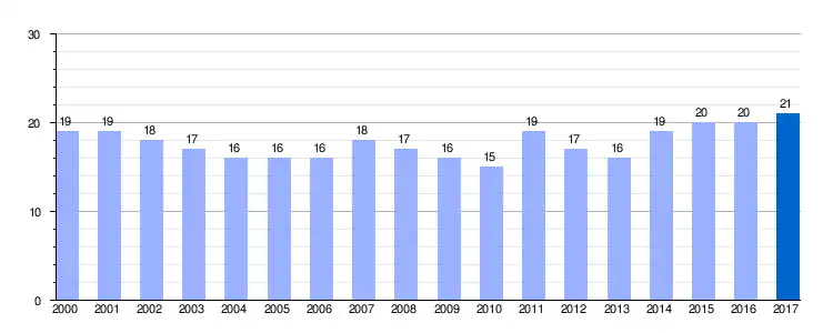 | Gráfica de evolución demográfica de Llama de la Guzpeña entre 2000 y 2017 |