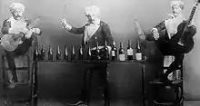 Los tres bemoles. Consiste la originalidad de estos artistas en producir bellas piezas musicales valiéndose de objetos que, por los usos a los que se destinan, están muy lejos de remplazar a los instrumentos de viento y cuerda. Actualmente trabajan en el Teatro Caracas donde son muy aplaudidos”. A pesar de la nota destacar la invención de algunos instrumentos, también se pueden observar en la foto la presencia de instrumentos conocidos como la guitarra, el violín, el xilófono, las campanas.[24] (Texto acompañando una fotografía del grupo).