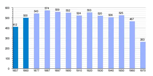| Gráfica de evolución demográfica de Los Valcárceres[16] entre 1857 y 1970 |