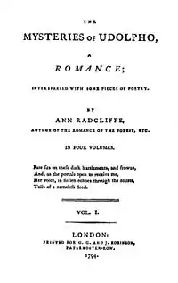 Los misterios de Udolfo es el romance gótico por antonomasia, repleto de incidentes de terror físico y psicológico; castillos remotos y ruinosos; acontecimientos supuestamente sobrenaturales; un villano melancólico y retorcido; y una heroína perseguida. A esto Radcliffe le añade extensas descripciones de paisajes exóticos en los Pirineos y los Apeninos. Se enmarca en el año 1584 en el sur de Francia y norte de Italia.