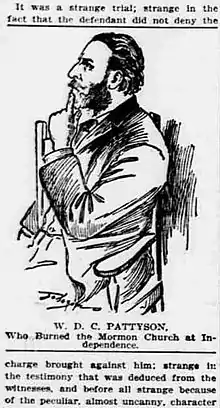 En julio de 1898, William David Creighton "WDC" Pattyson, de 46 años, al parecer un miembro 'suspendido' de la Iglesia RLDS de Boston, Massachusetts,[32] fue arrestado y detenido brevemente después de intentar quitar una cerca colocada alrededor del Templo Lote. Pattyson había sido bautizado en la secta Hedriquita en mayo de 1898.[33] Según sus detractores de la secta Temple Lot, Pattyson exigió que los funcionarios de la iglesia le cedieran la propiedad, alegando que él era el "Poderoso y Fuerte".[34] Fue detenido por la policía, pero luego puesto en libertad unos días después. A primeras horas del lunes 5 de septiembre de 1898, dañó el pequeño edificio sede de su iglesia al incendiarlo, luego caminó hasta la estación de policía y donde se entregó a la ley.[33] Después de que testificó en comparecencias ante el tribunal a fines de noviembre y principios de diciembre de 1898, el New York Times afirmó que Pattyson fue declarado "culpable pero loco" [32] y fue sentenciado a confinamiento en una institución mental en la ciudad de St. Joseph. Sin embargo, según informes de noticias locales y las propias explicaciones de Pattyson sobre su liberación, fue declarado "no culpable por razón de locura" y enviado a la institución mental porque el juez en funciones sintió que Pattyson no merecía un encarcelamiento criminal.[cita requerida]