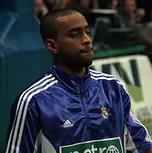 Louis Bullock en plena acción en el partido que enfrentó al Real Madrid con el DKV Joventut en noviembre de 2008 en el pabellón Olímpico de Badalona de la primera vuelta de la fase regular de la liga ACB.