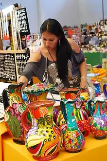 La alfarería y cerámica es el arte más practicado en México. Las formas y funciones de las piezas varían desde simples comales planos, utilizados para hacer tortillas, hasta para la elaboración de esculturas complejas llamadas Árboles de la vida.[19] Las formas más básicas, como comales, cazuelas, cuencos sencillos y otra mercancía de cocina y almacenamiento todavía se basan en diseños y otros artículos de almacenamiento se basan en antiguos diseños nativos. La cerámica y figuras decorativas están casi totalmente dominadas por las tradiciones europeas, especialmente en el centro de México. En algunos casos, hay una mezcla de ambas tradiciones, sobre todo en los diseños ornamentales, donde elementos autóctonos se combinan con elementos europeos.[20]