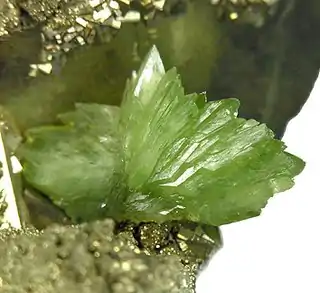 ![]() Grupo de cristales de ludlamita sobre pirita. Mina Huanuni, provincia de Dalence, Oruro (Bolivia). | ||