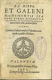 Luis Collado, Ex Hippo. et Galeni monumentis Isagoge summa diligentia decerpta ad faciendam medicinam non minus utilis quam necessaria, Valencia, 1561.