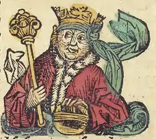 Luis I de Hungría retratado en una miniatura de la Crónica Iluminada (1360). | ||