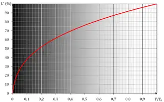 La CIE definió la luminosidad, L*, también llamada claridad, en este caso, a partir de la luminancia Y del color, expresada en candelas por metro cuadrado (cd.m-2), en relación con la luminancia del [color] blanco tomado como referencia. La luminosidad toma en este caso un valor entre 0 y 100:[2]