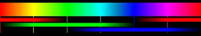 Los dispositivos de visualización en color (como la televisión o la pantalla de ordenador) mezclan los colores rojo, verde y azul para generar el espectro de color. En la ilustración, las barras estrechas inferiores de rojo, azul y verde muestran las mezclas relativas de estos tres colores usados para producir el color que se enseña arriba.
