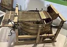 Otro tipo de sección de formación es la máquina de moldes cilíndricos inventada por John Dickinson en 1809, originalmente como competidora de la máquina de Fourdrinier.[10][11] Esta máquina utiliza un cilindro giratorio cubierto de malla parcialmente sumergido en un tanque de suspensión de fibra en el extremo húmedo para formar un papel con una distribución más aleatoria de las fibras de celulosa. Las máquinas cilíndricas pueden formar una lámina con mayor consistencia, lo que da una orientación de fibra más tridimensional que las consistencias más bajas de las máquinas de arrastre, lo que da como resultado un mayor calibre (espesor) y más rigidez en la dirección de la máquina, lo que es útil en envases de alimentos como cajas de cereal y otras cajas como detergente en polvo para ropa.