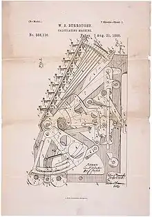 William Seward Burroughs recibió una patente para su máquina sumadora el 21 de agosto de 1888. La Burroughs Adding Machine Company evolucionó para producir máquinas electrónicas de facturación y mainframes, y eventualmente se fusionó con Sperry Corporation para formar Unisys. El nieto del inventor de la máquina sumadora, William S. Burroughs, fue un escritor perteneciente a la generación Beat (conocido mejor por su novela Naked Lunch).