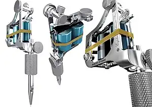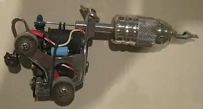 - Máquinas de tatuaje rotativas: la primera máquina de tatuaje rotativa con una excéntrica fue inventada en 1978 por el alemán Manfred Kohrs.[5][6] La primera máquina de tatuar inventada por Samuel O'Reilly y mejorada por los artistas del tatuaje a través de los años, estaba basada en la tecnología rotativa. Las máquinas de tipo rotativo usan un motor eléctrico para impulsar las agujas. Algunas actualizaciones recientes incluyen el uso de una barra fijada a un fleje para impulsar la aguja, emulando el funcionamiento característico de las máquinas de bobina.[7]