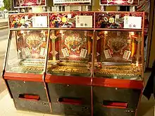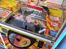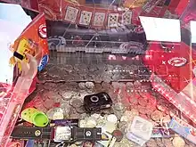 Con estos dispositivos hay una especie de diapositiva dentro de una caja de vidrio que empuja un poco las monedas que caen hacia adelante para que las monedas puedan conectarse con otras. Con el tiempo, las monedas traseras empujarán las monedas delanteras hacia las ranuras, o las monedas caerán provocando la emisión de fichas, con las que el jugador puede canjear ganancias como juguetes de plástico, encendedores o peluches.[1]