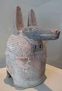 El dios Anubis, en egipcio Inpu, estaba al lado del dios Osiris como un importante dios funerario en el antiguo Egipto. Durante el ritual de embalsamamiento y el funeral, un sacerdote interpretaba el papel de Anubis. Podía transformarse en el dios usando una máscara. Para Anubis, este fenómeno aparece por primera vez constatado durante el reinado de Tutmosis III - Amenofis II, es decir, en el siglo XV a. C. La máscara muestra la cabeza del dios de la momificación y la muerte Anubis en una forma estilizada, generalmente se le representa en una forma mixta de cuerpo humano y cabeza de chacal. El negro del pelaje del animal aún es claramente reconocible, lo que no corresponde a la coloración natural marrón del animal, sino que este color en el arte egipcio se refiere simbólicamente al área de la muerte, por un lado, y por el otro, indica la existencia en la eternidad. La máscara consta de dos partes. El área del hocico está conformada por sí misma y provista de un pin perforado. Este se inserta a través de un orificio en la máscara y se puede mantener en su lugar mediante un pedazo de madera que se empuja a través del orificio en el pasador. Las dos rendijas de los ojos, que hacían posible que el sacerdote pudiera ver, se pueden apreciar claramente bajo el hocico cánido. Hay recortes para encajar los hombros en ambos lados, de modo que la máscara quede unida de manera razonable al torso. Las líneas pintadas que corren alrededor de la cabeza indican una peluca ritual. Une animal y humano de una manera estéticamente aceptable.