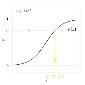 Este teorema muestra que para generar una variable aleatoria a partir de la función de distribución continua , generemos un número aleatorio y hacemos entonces .