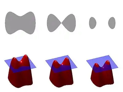 Una manera muy simple pero poderosa para comprender el método del conjunto de nivel es estudiar la ilustración adjunta antes de proceder a una definición más técnica, la que entonces se hace más comprensible. La figura de la derecha ilustra varias ideas importantes sobre el método del conjunto de nivel. En la esquina superior izquierda vemos una forma, es decir, una región delimitada, con un límite de buen comportamiento. Debajo de ella, la superficie roja es la gráfica de una función de conjunto de nivel de que determina esta forma, y la región azul representa el plano . El límite de la forma es entonces el conjunto de nivel cero de , mientras que la forma en sí es el conjunto de puntos en el plano para el cual es positivo (interior de la forma) o cero (en el borde).