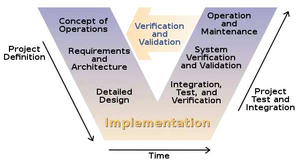 Es un proceso que representa la secuencia de pasos en el desarrollo del ciclo de vida de un proyecto. Se describen las actividades y resultados que deben producirse durante el desarrollo del producto. El lado izquierdo de la V representa la descomposición de las necesidades, y la creación de las especificaciones del sistema. El lado derecho de la V representa la integración de las piezas y su verificación. V significa «Verificación y validación». Es muy similar al modelo de la cascada clásico ya que es muy rígido y contiene una gran cantidad de iteraciones.