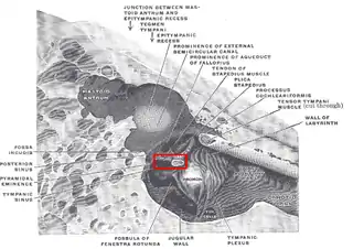 ![]() La pared medial y parte de las paredes posterior y anterior de la cavidad timpánica derecha, en vista lateral. | ||