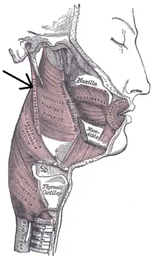 ![]() Músculos de faringe y mejilla (estilofaríngeo en el centro a la izquierda indicado con una flecha) | ||