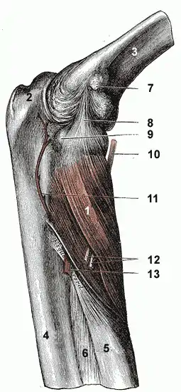 ![]() Músculo supinador, en el centro, etiquetado con el N.º 1. | ||