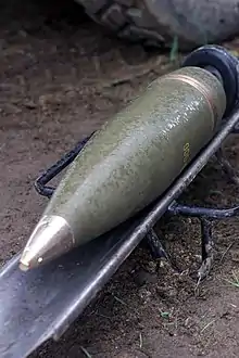 El cuerpo principal consiste en una ojiva de acero que contiene TNT o varias mezclas de RDX pintada de verde oliva con marcas en amarillo. La espoleta va atornillada en la punta de la ojiva. Una anilla metálica puede atornillarse a la punta para facilitar el transporte; esta se reemplaza por la espoleta antes de dispararse. El proyectil completo pesa 43,2 kg, mide 800 mm de largo y contiene 15,8% de su peso en explosivo. La munición es de dos partes, lo que significa que el obús M107 y la carga propulsora se transportan por separado y tienen que ser unidos antes del disparo.