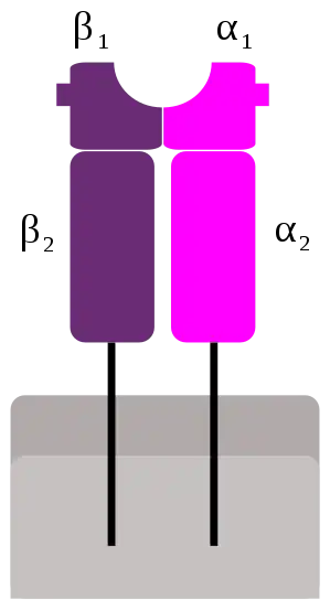 Al igual que las moléculas CMH I, las moléculas de clase II son también heterodímeros, pero en este caso se encuentran formados por dos péptidos homogéneos, una cadena α y una β, las cuales se encuentran ambas codificadas en el gen MHC.[1] La subdesignación α1, α2, etc. refiere a los dominios separados que existen dentro del gen HLA; cada dominio, por lo general, se encuentra codificado por un exón diferente dentro del gen, y algunos poseen dominios adicionales que codifican secuencias señalizadoras, secuencias transmembrana, etc.