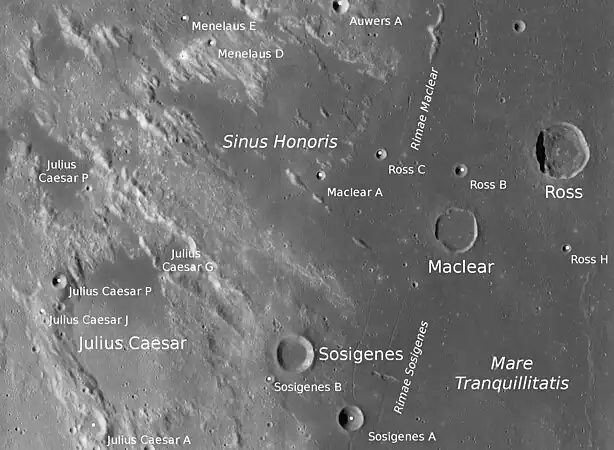Por convención estos elementos son identificados en los mapas lunares poniendo la letra en el lado del punto medio del cráter que está más cercano a Maclear.