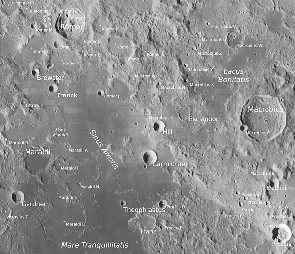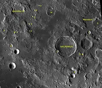 Por convención estos elementos son identificados en los mapas lunares poniendo la letra en el lado del punto medio del cráter que está más cercano a Macrobius.