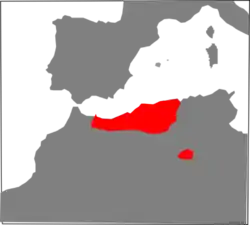 Su área de distribución se limita al norte del continente africano, en territorios del este de Marruecos hasta Melilla y norte de Argelia.