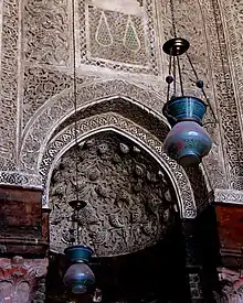 La Madrasa de Al-Nasir Muhammad es una de las tres únicas madrasas de El Cairo que albergaba las cuatro escuelas de jurisprudencia sunitas.[4] La madrasa alberga el último mihrab de estuco (nicho que indica la dirección de la oración ) en Egipto, único por sus protuberancias de estuco en relieve en forma de huevo en alto relieve con adornos perforados que decoran el capó del mihrab[4] El estilo recuerda mucho a la talla de estuco producida en Tabriz, Irán, bajo el dominio de los iljaníes mongoles, y los historiadores han sugerido que fue elaborado por artistas del Irán mongol o Tabriz.[2][3] Aparte del mihrab, relativamente poca decoración ha sobrevivido en general en el interior del edificio de al-Nasir Muhammad.[3]
